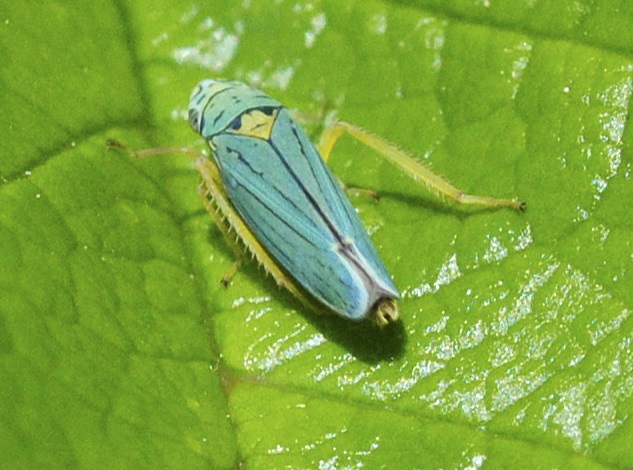 It might be a “sharpshooter” leaf hopper. As with the beetle family, leaf hoppers can come in psychedelic colors. Some have red and turquoise stripes, or bright orange with green and blue; even a most artistic pattern of blue and yellow streaks.