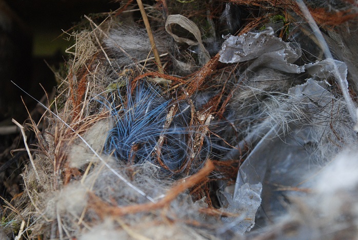 Here’s the nest. You can see moss, twigs, feathers and other materials.